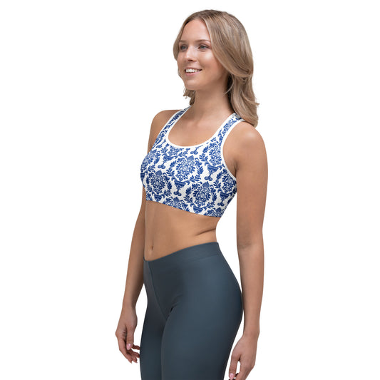 White Blue Pottery Print Sports bra